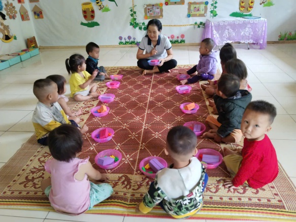 (Hình ảnh cô và trẻ nhận biết nút ghép- viên gạch)