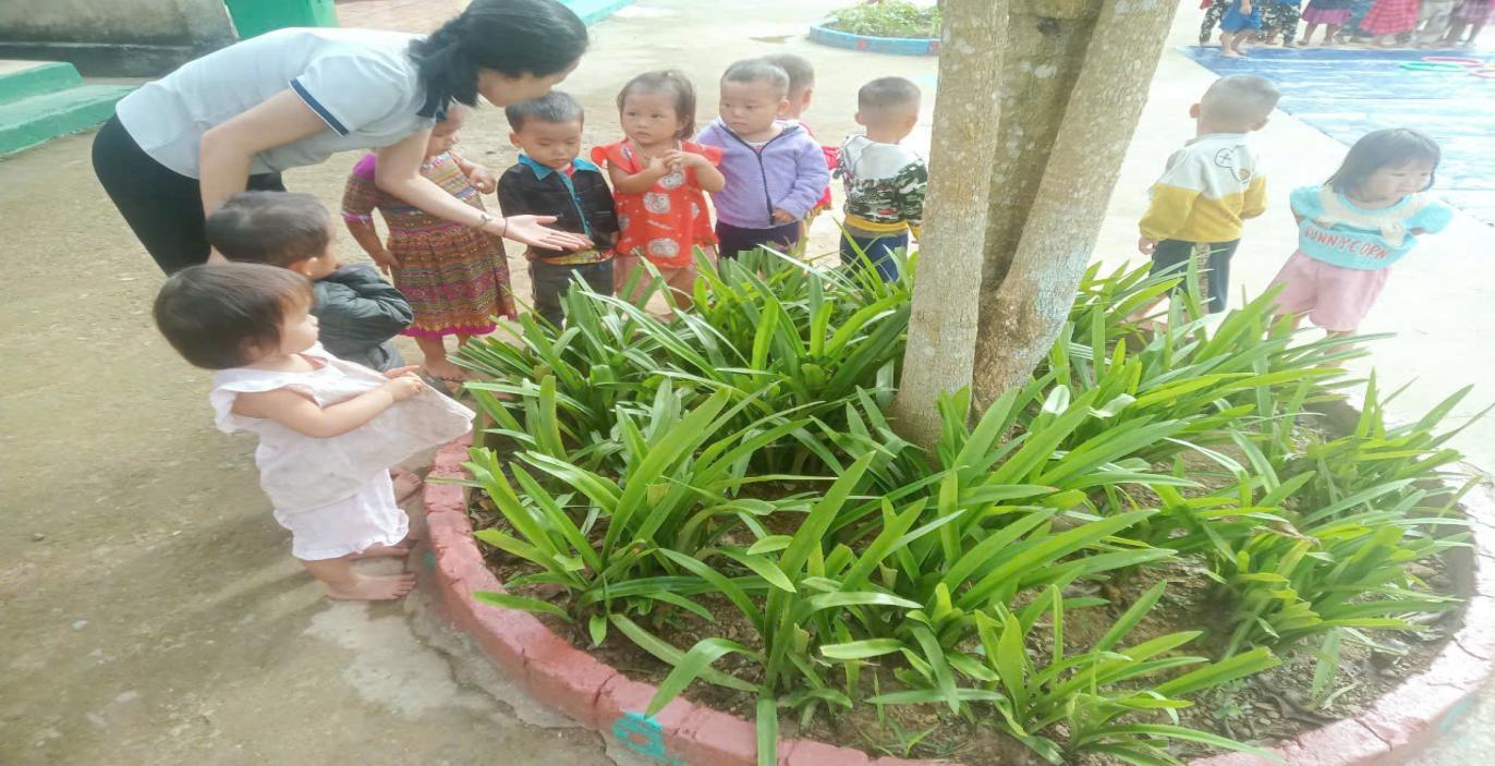 (Hình ảnh cô và trẻ quan sát “cây hoa loa kèn”)