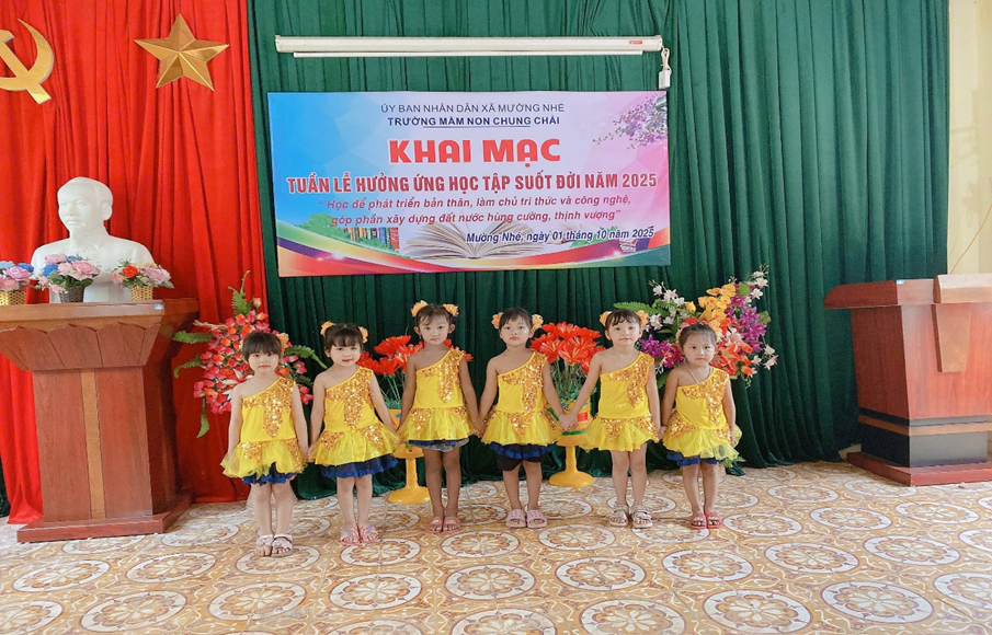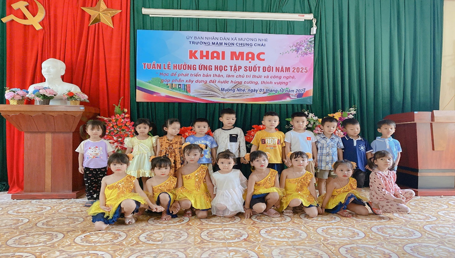 Sáng ngày 01/10/2025, Trường Mầm non Chung Chải long trọng tổ chức Lễ khai mạc hưởng ứng Tuần lễ học tập suốt đời năm 2025 với chủ đề: “Học để phát triển bản thân, làm chủ tri thức và công nghệ, góp phần xây dựng đất nước hùng cường, thịnh vượng”.